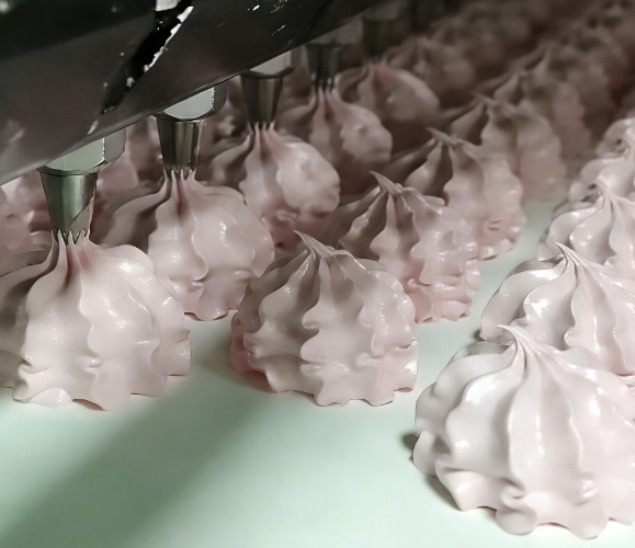 For highly precise and creative shapes, the stabilized aerated mass is accurately pumped to multi-color depositing heads. Sophisticated PLC control enables production of multi-layer marshmallows, center-filled varieties, colorful spheres, and complex 3D forms with exact weight control, silent operation, and outstanding stability.