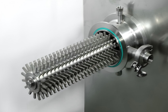 The aerated syrup enters an advanced rotor-stator homogenization chamber. High-speed rotation (1500–3000 rpm) creates powerful shear forces that break large bubbles into uniform micro-bubbles (typically 20–50 μm). The stator's specialized tooth design further intensifies mixing, preventing separation or clustering.