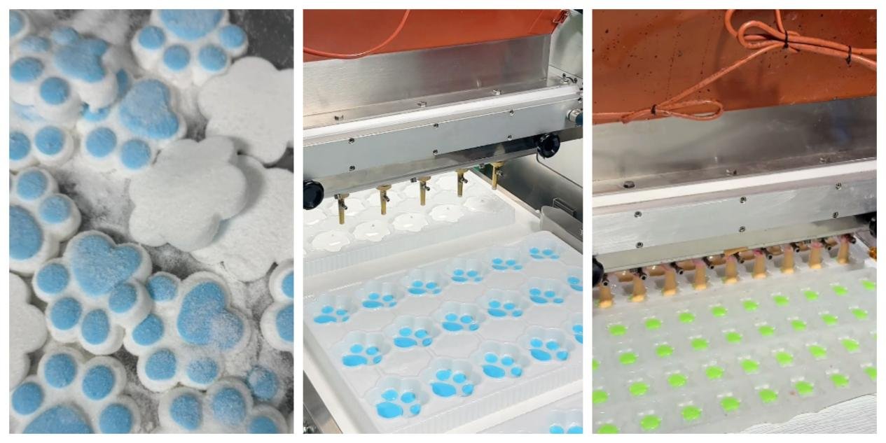 This marshmallow depositor is perfect for producing high volumes of cartoon-shaped marshmallows efficiently, with minimal waste and maximum flexibility.